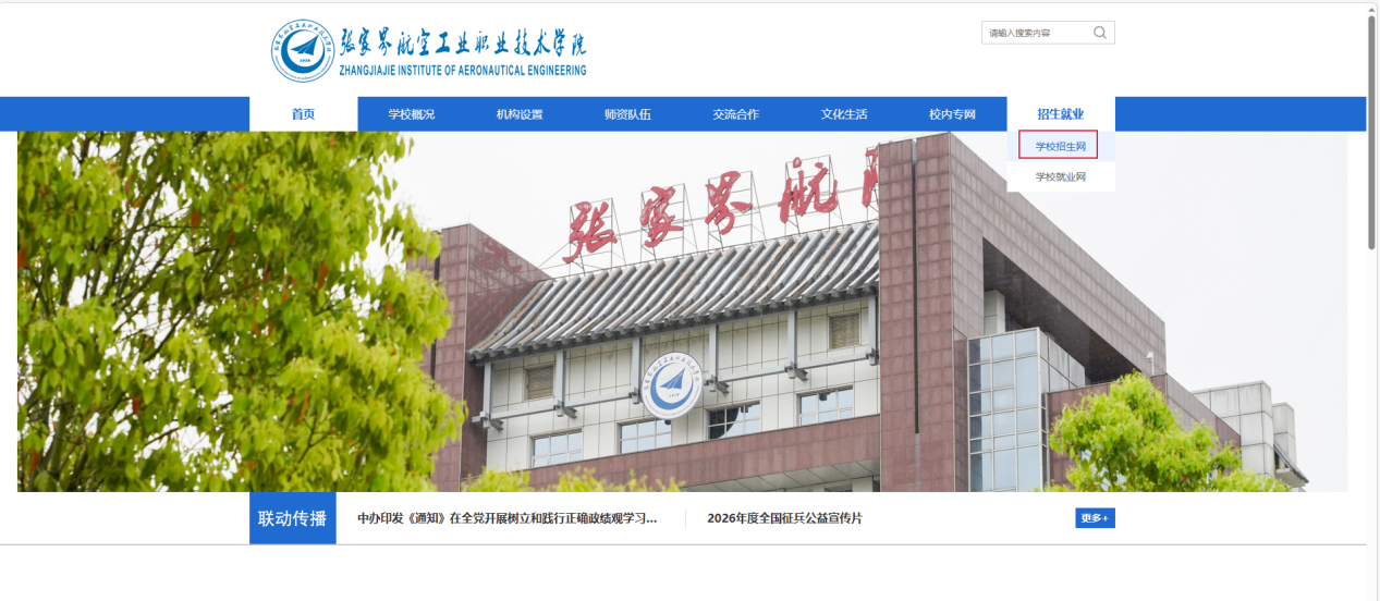 1.报名费缴费成功后,考生在规定时间内(3月11日14:30-3月13日17:00),打开学校官网https://www.zjjhy.edu.cn/,点击“招生就业”;