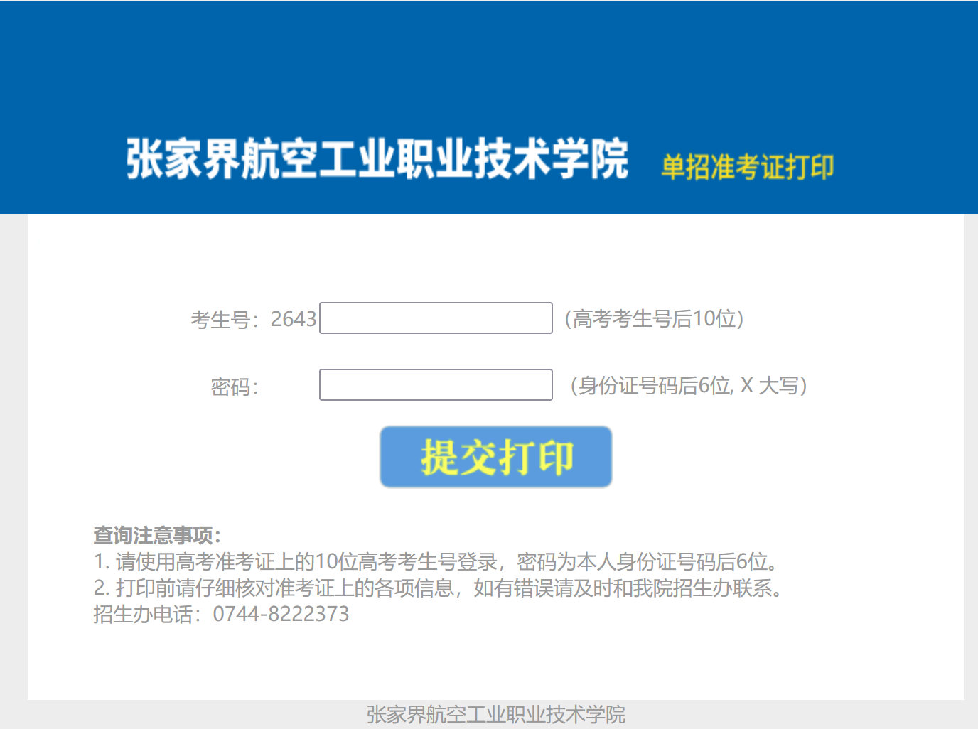 3.在单招准考证打印页面输入用户名,用户名为考生号后10位,密码为身份证后6位,X为大写,点击提交打印,备注:若已缴纳报考费用则可进行打印准考证,没有缴费的考生请缴纳完报考费用后3分钟后再登陆系统打印准考证;