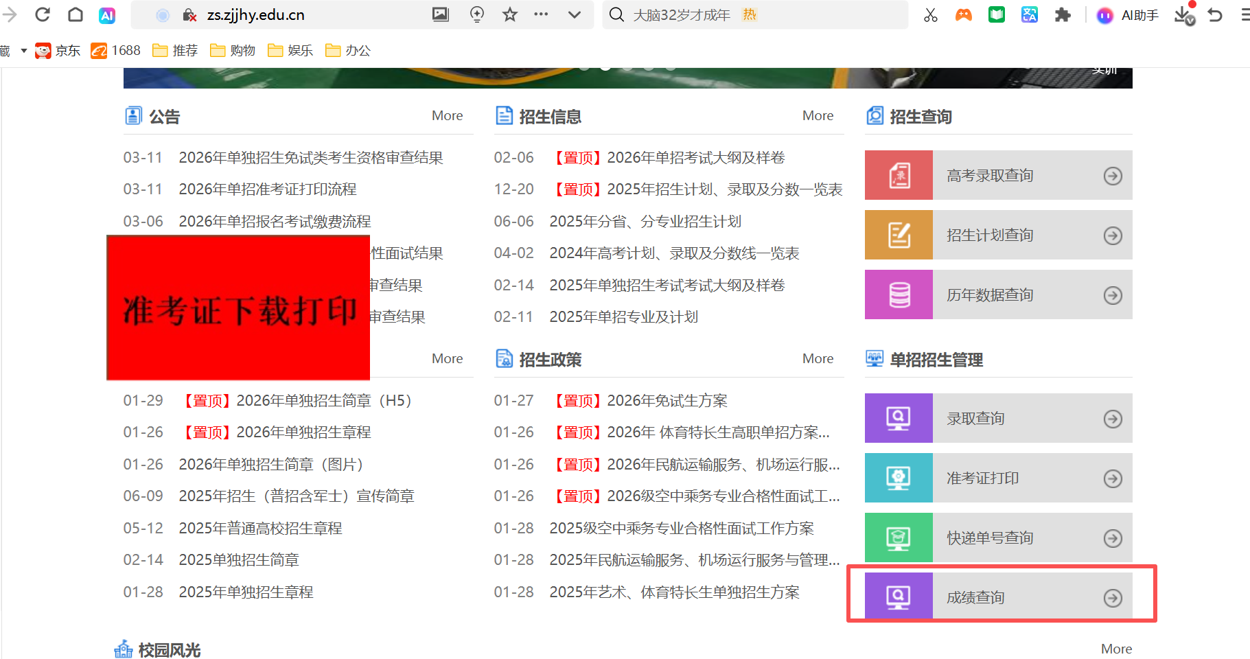 3、点击招生网右下角单招招生管理模块下的“成绩查询”